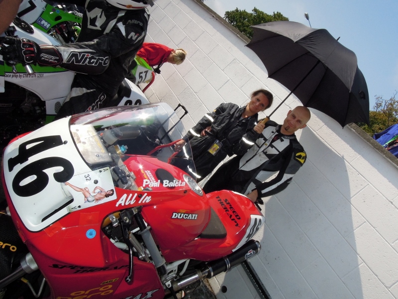 Bikes through (with a bit of sweet-talkin' from Steve) ok and set-up in Parc Ferme. All set for the race at 10h15. Then a delay is announced. And another. The weather is overcast and there is fog on the mountain. More delays and finally a race start at 12h30 or something like that. Too much waiting... but I keep focussed and am ready for it when we line up on Glencrutchery Road for the start of the Supertwins race.